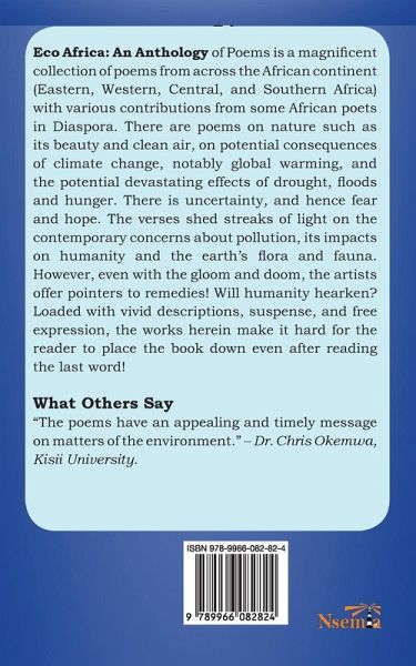 Eco Africa: An Anthology of Poems is a magnificent collection of poems from across the African continent (Eastern, Western, Central, and Southern Africa) with various contributions from some African poets in the Diaspora. There are poems on nature such as its beauty and clean air, on potential consequences of climate change, notably global warming, and the potentially devastating effects of drought, floods and hunger. There is uncertainty and hence fear and hope. The verses shed streaks of light on the contemporary concerns about pollution, its impacts on humanity and the earth's flora and fauna. However, even with the gloom and doom, the artists offer pointers to remedies! Will humanity hearken? Loaded with vivid descriptions, suspense, and free expression, the works herein make it hard for the reader to place the book down even after reading the last word! What Others Say "The poems have an appealing and timely message on matters of the environment." - Dr. Chris Okemwa, Kisii University.