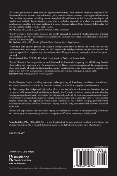 "To say this publication is timely would be a gross understatement. From theory to research to application, Dr. Pike reminds us-- in her deft, clear and at times lyrical manner-how to overcome the struggles and limitations of our artificial experiences by looking outside, metaphorically and literally, to find the most natural space and mindful tools available. Eco-art therapy is more than a method or approach; it's a whole new paradigm that simultaneously simplifies and makes profound the journey towards wellness. Quite frankly, I didn't realize this was a book that I needed to read...until I read it." - Dave Gussak, PhD, ATR-BC, professor, The Florida State University