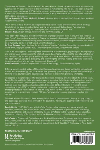 In response to the growing need for therapists to address increasing anxieties about the climate crisis, Bernie Neville and Keith Tudor address the issue in terms that help therapists reflect on their practice. Based on the authors' previous publications and incorporating new material, this book presents and explores ideas that have been largely neglected in person-centred literature. It re-visions person-centred psychology (PCP) from what has become predominantly its application to individuals to a broader perspective on and about life and the living world. Further, it takes a philosophical and cultural perspective to re-present and re-vision PCP as a 'we' psychology, an eco-psychology, and an eco-therapy.