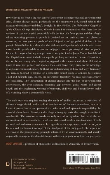 Eco-Nihilism: The Philosophical Geopolitics of the Climate Change Apocalypse argues that there are no versions of conquest capital compatible with the fact of a finite planet, and that the pursuit of growth is destined to not only exhaust our planetary resources, but generate profound social injustice and geopolitical violence in its pursuit.