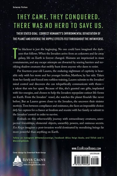 2025 American Fiction Awards Winner in Science Fiction: Alien/Space 2025 American Fiction Awards Finalist in Young Adult Fiction Cygnus Book Awards 2025 Long List for Science Fiction They came. They conquered. There was no hero to save us. Their stated goal: Correct humanity's environmental devastation of the planet and reverse the ripple effects felt throughout the infiniverse. The blackout is just the beginning. No one could have imagined the darkness that follows. When the Invaders arrive from an unknown and far away galaxy, life on Earth is forever changed. Humans are imprisoned in mass containments, and any escape attempts are thwarted by searing barriers and terrifying shadow creatures that swiftly hunt down anyone who dares to resist. For fourteen-year-old Lauren, the enduring nightmare of captivity is bearable only with her mom and her younger brother, Matthew, by her side. Taken from her family and forced into ruthless training, Lauren submits to the Invaders' mind control and discovers she can telepathically communicate with them-a talent that sets her apart. Because of this, she's granted rare gifts, implanted with bio-energies, and chosen to help the Invaders repopulate extinct life forms on Earth. From the Invaders' vessel, she watches the planet flourish like never before. But as Lauren grows closer to the Invaders, she uncovers their sinister motives. Torn between compliance and resistance, she faces an impossible choice: defy her captors for a chance at freedom and reunite with her family or submit to the Invaders' control in order to survive. Embark on this otherworldly journey with extraordinary creatures, unexpected friendships, elemental objects, unearthly powers, and ominous secrets. Eco Reign imagines a post-invasion world dominated by moralizing beings far more powerful than anything on Earth.