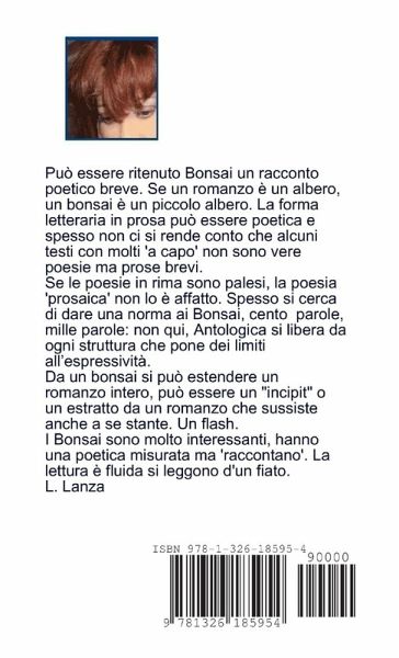 COLLANA BONSAI - (tascabile) - Può essere ritenuto Bonsai un racconto poetico breve. Se un romanzo è un albero, un bonsai è un piccolo albero. La forma letteraria in prosa può essere poetica e spesso non ci si rende conto che alcuni testi con molti 'a capo' non sono vere poesie ma prose brevi. Se le poesie in rima sono palesi, la poesia 'prosaica' non lo è affatto. Spesso si cerca di dare una norma ai Bonsai, cento parole, mille parole: non qui, Antologica si libera da ogni struttura che pone dei limiti all'espressività. Da un bonsai si può estendere un romanzo intero, può essere un "incipit" o un estratto da un romanzo che sussiste anche a se stante. Un flash. I Bonsai sono molto belli, hanno una poetica misurata ma 'raccontano'. La lettura è fluida si leggono d'un fiato. L. Lanza