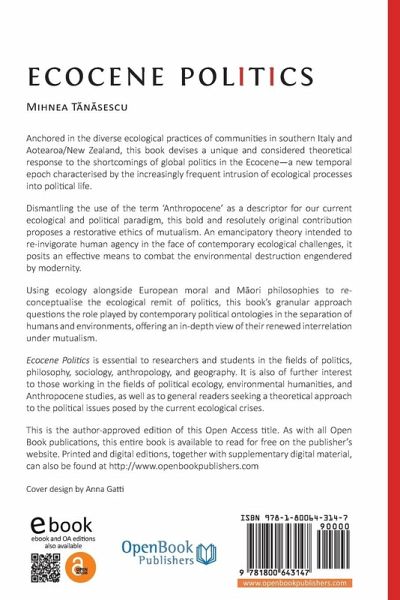 Anchored in the diverse ecological practices of communities in southern Italy and Aotearoa/New Zealand, this book devises a unique and considered theoretical response to the shortcomings of global politics in the Ecocene-a new temporal epoch characterised by the increasingly frequent intrusion of ecological processes into political life. Dismantling the use of the term 'Anthropocene' as a descriptor for our current ecological and political paradigm, this bold and resolutely original contribution proposes a restorative ethics of mutualism. An emancipatory theory intended to re-invigorate human agency in the face of contemporary ecological challenges, it posits an effective means to combat the environmental destruction engendered by modernity. Using ecology alongside European moral and M¿ori philosophies to re-conceptualise the ecological remit of politics, this book's granular approach questions the role played by contemporary political ontologies in the separation of humans and environments, offering an in-depth view of their renewed interrelation under mutualism. Ecocene Politics will be essential to researchers and students in the fields of politics, philosophy, sociology, anthropology, and geography. It will be of further interest to those working in the fields of political ecology, environmental humanities, and Anthropocene studies, as well as to general readers seeking a theoretical approach to the political issues posed by current ecological crises.