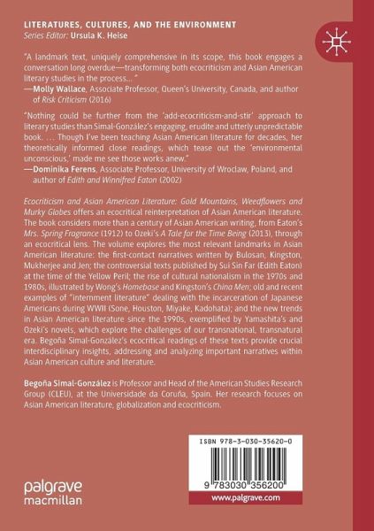 Ecocriticism and Asian American Literature: Gold Mountains, Weedflowers, and Murky Globes offers an ecocritical reinterpretation of Asian American literature. The book considers more than a century of Asian American writing, from Eaton's Mrs. Spring Fragrance (1912) to Ozeki's A Tale for the Time Being (2013), through an ecocritical lens. The volume explores the most relevant landmarks in Asian American literature: the first-contact narratives written by Bulosan, Kingston, Mukherjee, and Jen; the controversial texts published by Sui Sin Far (Edith Eaton) at the time of the Yellow Peril; the rise of cultural nationalism in the 1970s and 1980s, illustrated by Wong's Homebase and Kingston's China Men; old and recent examples of "internment literature" dealing with the incarceration of Japanese Americans during WWII (Sone, Houston, Miyake, Kadohata); and the new trends in Asian American literature since the 1990s, exemplified by Yamashita's andOzeki's novels, which explore the challenges of our transnational, transnatural era. Begoña Simal-González's ecocritical readings of these texts provide crucial interdisciplinary insights, addressing and analyzing important narratives within Asian American culture and literature.