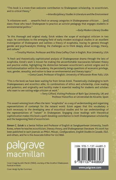 "'Ecophobia' has already begun to gain currency, making Estok the first early modernist to have a perceptible impact on ecocriticism. This alone would make Ecocriticism and Shakespeare a milestone work, setting aside its other considerable merits. It balances the claims of historicism and presentism, activism and theoretical integrity more deftly than previous studies. It unearths fresh or unsung categories in Shakespearean criticism such as environmental fear, disgust, and sleep. It dares those who teach Shakespeare to practice an activist pedagogy that engages students in environmental politics." - Early Modern Literary Studies