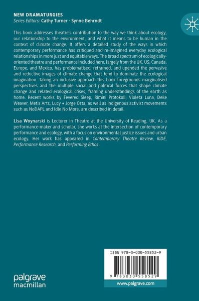 This book addresses theatre's contribution to the way we think about ecology, our relationship to the environment, and what it means to be human in the context of climate change. It offers a detailed study of the ways in which contemporary performance has critiqued and re-imagined everyday ecological relationships, in more just and equitable ways. The broad spectrum of ecologically-oriented theatre and performance included here, largely from the UK, US, Canada, Europe, and Mexico, have problematised, reframed, and upended the pervasive and reductive images of climate change that tend to dominate the ecological imagination. Taking an inclusive approach this book foregrounds marginalised perspectives and the multiple social and political forces that shape climate change and related ecological crises, framing understandings of the earth as home. Recent works by Fevered Sleep, Rimini Protokoll, Violeta Luna, Deke Weaver, Metis Arts, Lucy + Jorge Orta, as well as Indigenous activist movements such as NoDAPL and Idle No More, are described in detail.