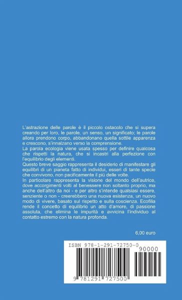 La parola ecologia viene usata spesso per definire qualcosa che rispetti la natura, che si incastri alla perfezione con l'equilibrio degli elementi. Questo breve saggio rappresenta il desiderio di manifestare gli equilibri di un pianeta fatto di individui, esseri di tante specie che convivono, non pacificamente il più delle volte. In particolare rappresenta la visione del mondo dell'autrice, dove accorgimenti volti al benessere non soltanto proprio, ma anche dell'altro da noi - e per altro s'intende qualsiasi essere, senziente o non - creerebbero una nuova esistenza, un nuovo modo di vivere, basato sul rispetto e sulla coscienza. Ecofilia rende il concetto di equilibrio un atto d'amore, di passione assoluta, che elimina le impurità e avvicina l'individuo al contatto estremo con la natura profonda.