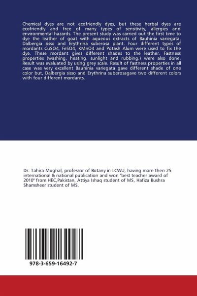 Chemical dyes are not ecofriendly dyes, but these herbal dyes are ecofriendly and free of many types of sensitivity, allergies and environmental hazards. The present study was carried out the first time to dye the leather of goat with aqueous extracts of Bauhinia variegata, Dalbergia sisso and Erythrina suberosa plant. Four different types of mordants CuSO4, FeSO4, KMnO4 and Potash Alum were used to fix the dye. These mordant gives different shades to the leather. Fastness properties (washing, heating. sunlight and rubbing.) were also done. Result was evaluated by using grey scale. Result of fastness properties in all case was very excellent Bauhinia variegata gave different shade of one color but, Dalbergia sisso and Erythrina suberosagave two different colors with four different mordants.