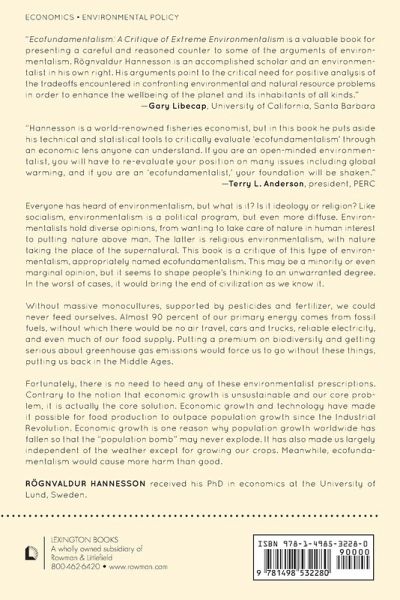 Ecofundamentalism: A Critique of Extreme Environmentalism is one of few books that focuses on ecofundamentalism, from its philosophical foundations to its policy prescriptions, instead of environmentalism as a whole. Ecofundamentalism places nature above man and is a possible threat to civilization. Rögnvaldur Hannesson critically examines central tenets of environmentalism such as sustainability, biodiversity, and the precautionary principle and he shows that issues like the "population bomb," global warming, and the depletion of the oceans are exaggerated or nonexistent threats.