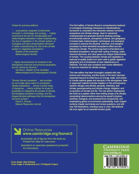The third edition of Gordon Bonan's comprehensive textbook introduces an interdisciplinary framework to understand the interaction between terrestrial ecosystems and climate change. Ideal for advanced undergraduate and graduate students studying ecology, environmental science, atmospheric science, and geography, it reviews basic meteorological, hydrological, and ecological concepts to examine the physical, chemical, and biological processes by which terrestrial ecosystems affect and are affected by climate. This new edition has been thoroughly updated with new science and references. The scope has been expanded beyond its initial focus on energy, water, and carbon to include reactive gases and aerosols in the atmosphere. The new edition emphasizes the Earth as a system, recognizing interconnections among the planet's physical, chemical, biological, and socioeconomic components, and emphasizing global environmental sustainability. Each chapter contains chapter summaries and reviewquestions, and with over 400 illustrations, including many in color, this textbook will once again be an essential student guide.