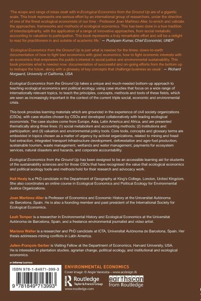 'The scope and range of ideas dealt with in Ecological Economics from the Ground Up are of a gigantic scale. This book represents one serious effort by an international group of researchers, under the direction of one of the finest ecological economists of our time - Professor Joan Martínez-Alier, to enrich and validate the approaches, frameworks and methods of ecological economics. This has been done in a true tradition of interdisciplinarity, with the application of a range of innovative approaches, from social metabolic accounting to valuation to participation. This book represents a truly remarkable effort and will be a delight to read for practitioners in and outside of academic life.'