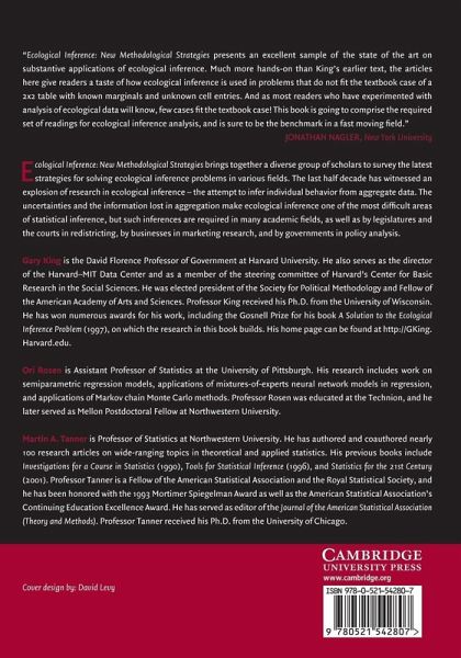 Introduction: information in ecological inference: an introduction Gary King, Ori Rosen and Martin A. Tanner; Part I: 1. Prior and likelihood choices in the analysis of ecological data Jonathan C. Wakefield; 2. Information in aggregate data David G. Steel, Eric J. Beh and Raymond Lourenco Chambers; 3. Using ecological inference for contextual research: when aggregation bias is the solution as well as the problem D. Stephen Voss; Part II: 4. Extending King's ecological inference model to multiple elections using Markov chain Monte Carlo Jeffry B. Lewis; 5. Ecological regression and ecological inference Bernard Grofman and Samuel Merrill; 6. Using prior information to aid ecological inference: a Bayesian approach J. Kevin Corder and Christina Wolbrecht; 7. An information theoretic approach to ecological estimation and inference George G. Judge, Douglas J. Miller and Wendy K. Tam Cho; 8. Ecological panel inference from repeated cross sections Rob Eisinga, Ben Pelzer and Philip Hans B. F. Franses; Part III: 9. Multi-party split-ticket voting estimation as an ecological inference problem Kenneth R. Benoit, Michael Laver and Daniela Giannetti; 10. Ecological inference in the presence of temporal dependence Kevin M. Quinn; 11. A spatial view of the ecological inference problem Carol A. Gotway and Linda J. Young; 12. Places and relationships in ecological inference: uncovering contextual effects through a geographically weighted autoregressive model Ernesto Calvo and Marcelo Escolar; 13. Ecological inference incorporating spatial dependence Sebastien Haneuse and Jonathan C. Wakefield; Part IV: 14. A common framework for ecological inference in epidemiology, political science and sociology Ruth E. Salway and Jonathan C. Wakefield; 15. A structured comparison of the Goodman regression, the truncated normal, and the binomial-beta hierarchical methods for ecological inference Rogério Silva de Mattos and Álvaro Veiga; 16. A comparison of the numerical properties of ei methods Micah Altman, Jeff Gill and Michael P. McDonald.