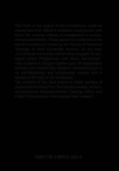 This book is the poduct of the contributions made byresearchers from different academic backgrounds whoshare the common interest of engagement in environmentalsustainability. These papers were collected at theend of a conference hosted by the Faculty of ProtestantTheology at Ruhr Universität Bochum on the topic"Churches as civil society stakeholders engaged for ecologicaljustice: Perspectives from Africa and Europe".This conference brought together upto 30 researchers/scholars who shared their research interests/findings inan interdisciplinary and bicontinental manner and inrelation to the topic of our conference.The contents of this book therefore reflect opinions ofresearchers/scholars from Pentecostal studies, environmentalscience, Religious Studies, Theology, Ethics, andPublic Policy Analysis who engaged their research.