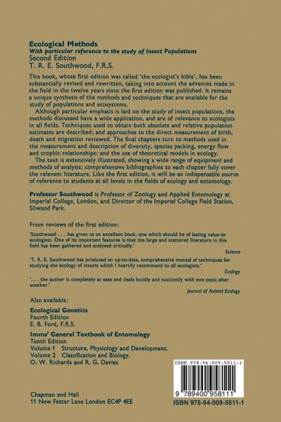 1 Introduction to the study of animal populations.- 1.1 POPULATION ESTIMATES.- 1.2 ERRORS AND CONFIDENCE.- 2 The sampling programme and the measurement and description of dispersion.- 2.1 PRELIMINARY SAMPLING.- 2.2 THE SAMPLING PROGRAMME.- 2.3 DISPERSION page.- 2.4 SEQUENTIAL SAMPLING.- 2.5 PRESENCE OR ABSENCE SAMPLING.- 2.6 SAMPLING A FAUNA.- 2.7 BIOLOGICAL AND OTHER QUALITATIVE ASPECTS OF SAMPLING.- 3 Absolute population estimates using marking techniques.- 3.1 METHODS OF MARKING ANIMALS.- 3.2 CAPTURE-RECAPTURE METHODS OF ESTIMATING POPULATION PARAMETERS.- 4 Absolute population estimates by sampling a unit of habitat -air, plants, plant products and vertebrate hosts.- 4.1 SAMPLING FROM THE AIR.- 4.2 SAMPLING FROM PLANTS.- 4.3 SAMPLING FROM VERTEBRATE HOSTS.- 5 Absolute population estimates by sampling a unit of habitat-soil and litter page.- 5.1 SAMPLING.- 5.2 MECHANICAL METHODS OF EXTRACTION.- 5.3 BEHAVIOURAL OR DYNAMIC METHODS.- 5.4 SUMMARY OF THE APPLICABILITY OF THE METHODS.- 6 Absolute population estimates by sampling a unit of habitat - freshwater habitats.- 6.1 OPEN WATER.- 6.2 VEGETATION.- 6.3 BOTTOM FAUNA page.- 7 Relative methods of population measurement and the derivation of absolute estimates.- 7.1 FACTORS AFFECTING THE SIZE OF RELATIVE ESTIMATES.- 7.2 THE USES OF RELATIVE METHODS.- 7.3 RELATIVE METHODS-CATCH PER UNIT EFFORT.- 7.4 RELATIVE METHODS-TRAPPING.- 8 Estimates based on products and effects of insects.- 8.1 PRODUCTS.- 8.2 EFFECTS.- 9 Observational and experimental methods for the estimation of natality, mortality and dispersal.- 9.1 NATALITY.- 9.2 MORTALITY.- 9.3 DISPERSAL.- 10 The construction, description and analysis of age-specific life-tables.- 10.1 TYPES OF LIFE-TABLE AND THE BUDGET.- 10.2 THE CONSTRUCTION OF A BUDGET.- 10.3 THEDESCRIPTION OF BUDGETS AND LIFE-TABLES.- 10.4 THE ANALYSIS OF LIFE-TABLE DATA.- 11 Age-grouping of insects, time-specific life-tables and predictive population models.- 11.1 AGE-GROUPING OF INSECTS.- 11.2 TIME-SPECIFIC LIFE TABLE AND SURVIVAL RATES.- 11.3 PREDICTIVE POPULATION MODELS.- 12 Systems analysis and modelling in ecology.- 12.1 TYPES OF SYSTEMS MODEL.- 12.2 ANALYSIS AND SIMULATION IN MODELS.- 12.3 DETERMINISTIC AND STOCHASTIC MODELS.- 12.4 DIFFERENCE AND DIFFERENTIAL MODELS.- 13 Diversity, species packing and habitat description.- 13.1 DIVERSITY.- 13.2 SPECIES PACKING.- 13.3 HABITATS.- 14 The estimation of productivity and the construction of energy budgets.- 14.1 ESTIMATION OF STANDING CROP.- 14.2 ESTIMATION OF ENERGY FLOW.- 14.3 THE ENERGY BUDGET, EFFICIENCIES AND TRANSFER COEFFICIENTS page.- 14.4 ASSESSMENT OF ENERGY AND TIME COST STRATEGIES.- Author Index.- General Index.