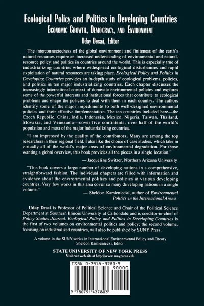 Uday Desai is Professor of Political Science and Chair of the Political Science Department at Southern Illinois University at Carbondale and is coeditor-in-chief of Policy Studies Journal. Ecological Policy and Politics in Developing Countries is the first of two volumes on environmental politics and policy; the second volume, focusing on industrialized countries, will also be published by SUNY Press.