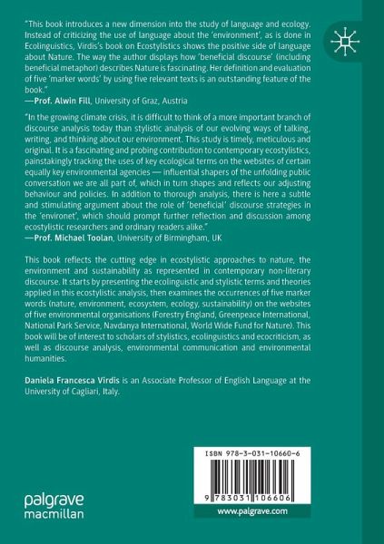 This book reflects the cutting edge in ecostylistic approaches to nature, the environment and sustainability as represented in contemporary non-literary discourse. Firstly, the book presents the ecolinguistic and stylistic terms and theories applied in this ecostylistic analysis (ecosophy, beneficial, ambivalent and destructive discourses; and foregrounding, point of view, metaphor), and reviews the most recent literature in the field of ecostylistics. Secondly, the book examines the occurrences of five marker words (nature, environment, ecosystem, ecology, sustainability) on the websites of five environmental organisations and agencies (Forestry England, Greenpeace International, National Park Service, Navdanya International, World Wide Fund for Nature). The main research purpose of this study is to identify beneficial discourses in the environet and to investigate the beneficial ecostylistic strategies utilised to produce them. Above all, this book reminds us humans that wedo notstand apart from nature: we are a part of it. The book will be of interest to scholars of stylistics, ecolinguistics and ecocriticism, as well as scholars of discourse analysis, environmental communication and environmental humanities.