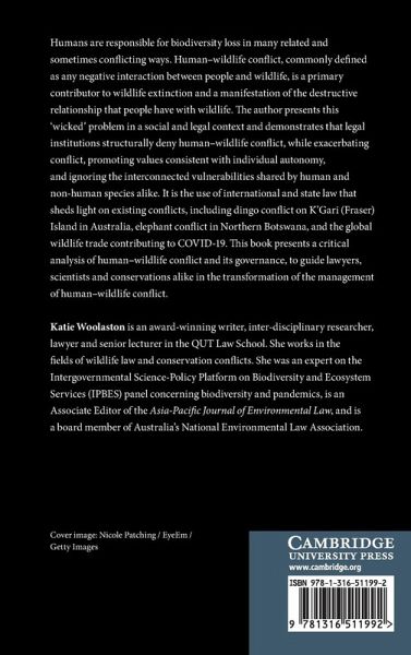 Humans are responsible for biodiversity loss in many related and sometimes conflicting ways. Human-wildlife conflict, commonly defined as any negative interaction between people and wildlife, is a primary contributor to wildlife extinction and a manifestation of the destructive relationship that people have with wildlife. The author presents this 'wicked' problem in a social and legal context and demonstrates that legal institutions structurally deny human-wildlife conflict, while exacerbating conflict, promoting values consistent with individual autonomy, and ignoring the interconnected vulnerabilities shared by human and non-human species alike. It is the use of international and state law that sheds light on existing conflicts, including dingo conflict on K'Gari-Fraser Island in Australia, elephant conflict in Northern Botswana, and the global wildlife trade contributing to COVID-19. This book presents a critical analysis of human-wildlife conflict and its governance, to guide lawyers, scientists and conservations alike in the transformation of the management of human-wildlife conflict.