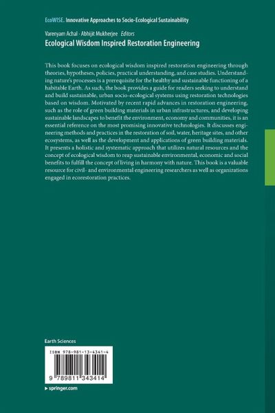 This book focuses on ecological wisdom inspired restoration engineering through theories, hypotheses, policies, practical understanding, and case studies. Understanding nature's processes is a prerequisite for the healthy and sustainable functioning of a habitable Earth. As such, the book provides a guide for readers seeking to understand and build sustainable, urban socio-ecological systems using restoration technologies based on wisdom. Motivated by recent rapid advances in restoration engineering, such as the role of green building materials in urban infrastructures, and developing sustainable landscapes to benefit the environment, economy and communities, it is an essential reference on the most promising innovative technologies. It discusses engineering methods and practices in the restoration of soil, water, heritage sites, and other ecosystems, as well as the development and applications of green building materials. It presents a holistic and systematic approach that utilizes natural resources and the concept of ecological wisdom to reap sustainable environmental, economic and social benefits to fulfill the concept of living in harmony with nature. This book is a valuable resource for civil- and environmental engineering researchers as well as organizations engaged in eco-restoration practices.