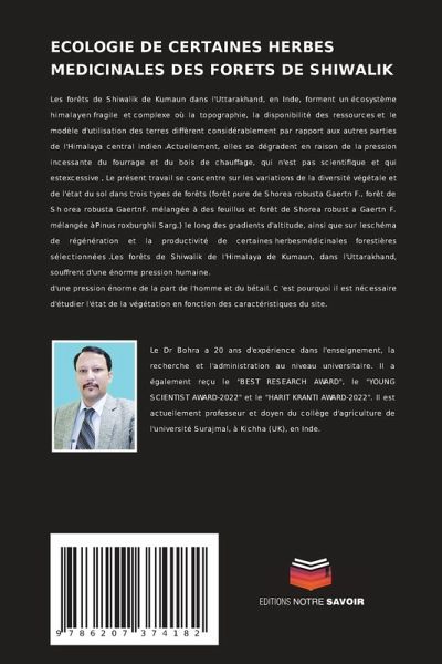 Les forêts de Shiwalik de Kumaun dans l'Uttarakhand, en Inde, forment un écosystème himalayen fragile et complexe où la topographie, la disponibilité des ressources et le modèle d'utilisation des terres diffèrent considérablement par rapport aux autres parties de l'Himalaya central indien .Actuellement, elles se dégradent en raison de la pression incessante du fourrage et du bois de chauffage, qui n'est pas scientifique et qui estexcessive , Le présent travail se concentre sur les variations de la diversité végétale et de l'état du sol dans trois types de forêts (forêt pure de Shorea robusta Gaertn F., forêt de Sh orea robusta GaertnF. mélangée à des feuillus et forêt de Shorea robust a Gaertn F. mélangée àPinus roxburghii Sarg.) le long des gradients d'altitude, ainsi que sur leschéma de régénération et la productivité de certaines herbesmédicinales forestières sélectionnées .Les forêts de Shiwalik de l'Himalaya de Kumaun, dans l'Uttarakhand, souffrent d'une énorme pression humaine.d'une pression énorme de la part de l'homme et du bétail. C 'est pourquoi il est nécessaire d'étudier l'état de la végétation en fonction des caractéristiques du site.