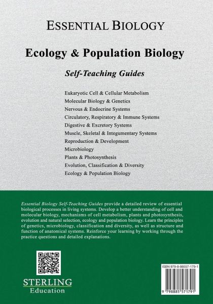 Essential self-teaching guide on ecology and population biology. From the foundations of a living cell to the complex mechanisms of gene expression, Essential Biology Self-Teaching Guides are a comprehensive compendium of clearly explained texts to learn and master multifaceted biology topics. These guides provide a detailed review of fundamental biological processes of living systems. Develop a better understanding of cell and molecular biology, mechanisms of cell metabolism, plants and photosynthesis, evolution and natural selection, ecology and population biology. Learn the principles of genetics, microbiology, classification and diversity, as well as structure and function of anatomical systems. Reinforce your learning by working through the practice questions and detailed explanations. Created by highly qualified biology instructors, researchers, and education specialists, these books empower readers by helping them increase their understanding of biology.