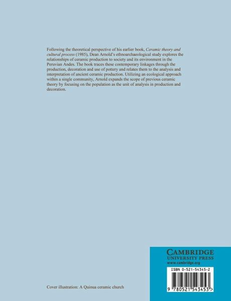 Following the theoretical perspective of his earlier book, Ceramic Theory and Cultural Process (1985), Dean Arnold's ethnoarchaeological study explores the relationships of ceramic production to society and its environment in the Peruvian Andes. The book traces these contemporary linkages through the production, decoration, and use of pottery and relates them to the analysis and interpretation of ancient ceramic production. Utilizing an ecological approach within a single community, Arnold expands the scope of previous ceramic theory by focusing on the population as the unit of analysis in production and decoration.