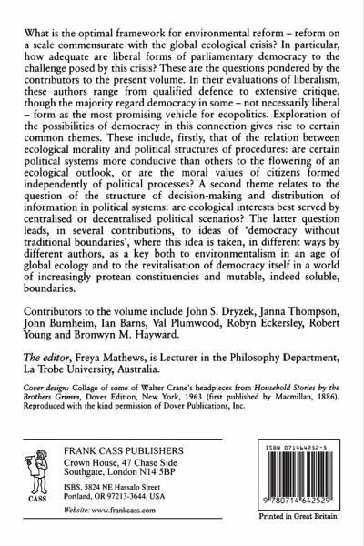 What is the optimal political framework for environmental reform - reform on a scale commensurate with the global ecological crisis? How adequate are liberal forms of parliamentary democracy to face the challenges posed? These are the questions pondered by the contributors to this volume.