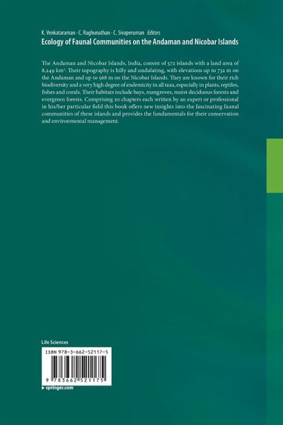 The Andaman and Nicobar Islands, India, consist of 572 islands with a land area of 8,249 km 2 . Their topography is hilly and undulating, with elevations up to 732 m on the Andaman and up to 568 m on the Nicobar Islands. They are known for their rich biodiversity and a very high degree of endemicity in all taxa, especially in plants, reptiles, fishes and corals. Their habitats include bays, mangroves, moist deciduous forests and evergreen forests. Comprising 20 chapters each written by an expert or professional in his/her particular field this book offers new insights into the fascinating faunal communities of these islands and provides the fundamentals for their conservation and environmental management.
