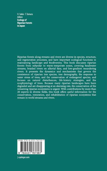 Features of riparian forests in Japan.- Geography, disturbance regime and dynamics of sediments in riparian zone.- Occurrence of hillslope processes affecting riparian vegetation in upstream watersheds of Japan.- Sediment dynamics and characteristics with respect to river disturbance.- Riparian community.- Vegetation-geographic evaluation of the syntaxonomic system of valley-bottom forests occurring in the cooltemperate zone of the Japanese Archipelago.- Riparian forests in headwater stream.- Coexistence mechanisms of three riparian species in the upper basin with respect to their life histories, ecophysiology, and disturbance regimes.- Population dynamics and key stages in two Japanese riparian elements.- Rodent seed hoarding and regeneration of Aesculus turbinata: patterns, processes and implications.- Longitudinal variation in disturbance regime and community structure of a riparian forest established on a small alluvial fan in warm-temperate southern Kyushu, Japan.- Riparian forests on wide alluvial fan.- Structure and composition of riparian forests with reference to geomorphic conditions.- Mosaic structure of riparian forests on the riverbed and floodplain of a braided river: A case study in the Kamikouchi Valley of the Azusa River.- Coexistence of Salix species in a seasonally flooded habitat.- Riparian forests in lowland regions.- Process of willow community establishment and topographic change of riverbed in a warm-temperate region of Japan.- Growth and nutrient economy of riparian Salix gracilistyla.- The expansion of woody shrub vegetation (Elaeagnus umbellata) along a regulated river channel.- Riparian forests in wetland.- Distribution pattern and regeneration of swamp forest species with respect to site conditions.- Flooding adaptations of wetland trees.- Species diversity of riparian forests.- Diversity of tree species in mountain riparian forest in relation to disturbance-mediated microtopography.- Diversity of forest floor vegegation with landform type.- Endangered species and its conservation.- Ecology and conservation of an endangered willow, Salix hukaoana.- Strategy for the reallocation of plantations to semi-natural forest for the conservation of endangered riparian tree species.- Conclusion.- General conclusions concerning riparian forest ecology and conservation.