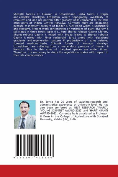 Shiwalik forests of Kumaun in Uttarakhand, India forms a fragile and complex Himalayan Ecosystem where topography, availability of resources and land use pattern differ graeatly while compared to the othe other parts of Indian Central Himalaya. Currently, they are degrading because of incessent pressure of fodder & fuel wood which is unscientific and excessive. Present work concentrates on variations of plant diversity & soil status in three forest types (i.e., Pure Shorea robusta Gaertn F.forest, Shorea robusta Gaertn F. mixed with broad leaved & Shorea robusta Gaertn F. mixed with Pinus roxburghii Sarg.) along with elevationsl gradients and regeneration pattern & producitivity of some selected forested medicinal herbs. Shiwalik forests of Kumaun Himalaya, Uttarakhand are suffering from a tremendous pressure of human & livestock. Due to this some of the plant species are under threat. Therefore, it is neccessary to study the vegetational status with respect to their site characteristics.