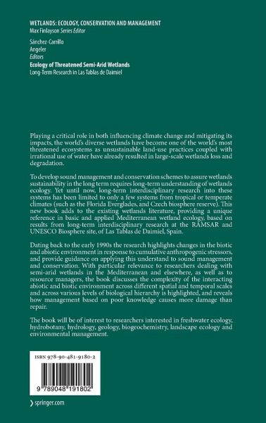 Playing a critical role in both influencing climate change and mitigating its impacts, the world's diverse wetlands have become one of the world's most threatened ecosystems as unsustainable land-use practices coupled with irrational use of water have already resulted in large-scale wetlands loss and degradation.To develop sound management and conservation schemes to assure wetlands sustainability in the long term requires long-term understanding of wetlands ecology. Yet until now, long-term interdisciplinary research into these systems has been limited to only a few systems from tropical or temperate climates (such as the Florida Everglades, and Czech biosphere reserve). This new book adds to the existing wetlands literature, providing a unique reference in basic and applied Mediterranean wetland ecology, based on results from long-term interdisciplinary research at the RAMSAR and UNESCO Biosphere site, of Las Tablas de Daimiel, Spain.Dating back to the early 1990s the research highlights changes in the biotic and abiotic environment in response to cumulative anthropogenic stressors, and provide guidance on applying this understand to sound management and conservation. With particular relevance to researchers dealing with semi-arid wetlands in the Mediterranean and elsewhere, as well as to resource managers, the book discusses the complexity of the interacting abiotic and biotic environment across different spatial and temporal scales and across various levels of biological hierarchy is highlighted, and reveals how management based on poor knowledge causes more damage than repair.The book will be of interest to researchers interested in freshwater ecology, hydrobotany, hydrology, geology, biogeochemistry, landscape ecology and environmental management.