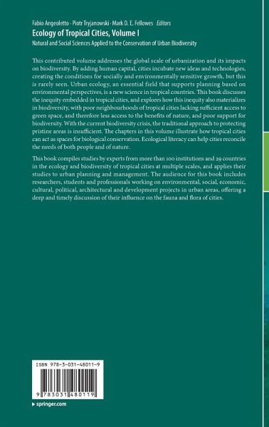 This contributed volume addresses the global scale of urbanization and its impacts on biodiversity. By adding human capital, cities are incubators for new ideas and technologies, creating the possibility for socially and environmentally sensitive growth, but this is rarely seen. Urban ecology, an essential field that supports planning based on environmental perspectives, is a new science in tropical countries. This book discusses the social inequity embedded in tropical cities and explores how this inequity also materializes in biodiversity, with poor neighborhoods of tropical cities lacking sufficient access to green space, and therefore reduced access to the benefits of nature, and poor support for biodiversity. With the current biodiversity crisis, the traditional approach to protecting pristine areas is insufficient. The chapters in this volume illustrate how tropical cities can act as spaces for biological conservation. Ecological literacy can help cities reconcile the needs of both people and of nature.