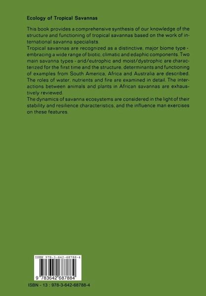 This book examines the ecological characteristics of tropical savanna- most simply defined as those ecosystems which lie between the equatorial rainforests and the deserts and semi-deserts of Africa, Australia and South America. These savannas form a continuum of physiognomic types ranging from closed woodlands with a heliophytic grass understorey, through open savanna woodlands to treeless edaphic grasslands. In all areas Kranz syndrome or C4 grasses dominate the herbaceous layer while the woody component, at the moist end of the moisture gradient, comprises fire tolerant trees and shrubs. Tropi ca 1 savannas occupy the greater area of the southern conti nent- some 65% of Africa, 60% of Austral ia and 45% of South America. Oespi te their vast area and their present and potential importance in terms of livestock and crop production, they have not enjoyed the intensity of research interest devoted during the last several decades to the deserts, rainforests and mediterranean regions. Indeed they are probably the least well understood of the world's major terrestrial ecosystems. With a few notable exceptions, ecological studies in tropical savannas have been 1 imited to scattered and rather di sparate ventures. The fi rst integrated study of a tropical savanna was probably that undertaken in the Ivory Coast by Lamotte and associates, while Medina and others had conducted important ecophysiological work in the Venezuelan llanos.