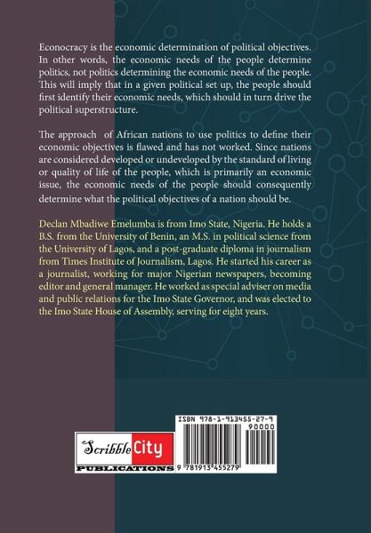 Econocracy is the economic determination of political objectives. In other words, the economic needs of the people determine politics, not politics determining the economic needs of the people. This will imply that in a given political set up, the people should first identify their economic needs, which should in turn drive the political superstructure. The approach of African nations to use politics to define their economic objectives. is flawed and has not worked. Since nations are considered developed or undeveloped by the standard of living or quality of life of the people, which is primarily an economic issue, the economic needs of the people should consequently determine what the political objectives of a nation should be.