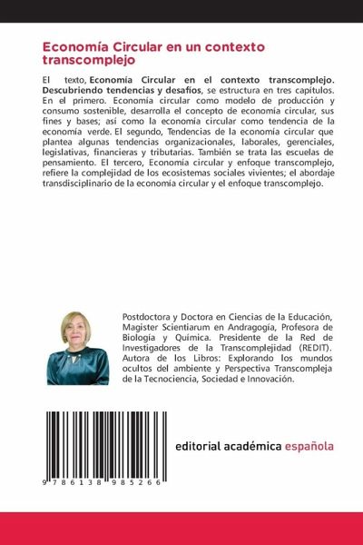 El texto, Economía Circular en el contexto transcomplejo. Descubriendo tendencias y desafíos, se estructura en tres capítulos. En el primero. Economía circular como modelo de producción y consumo sostenible, desarrolla el concepto de economía circular, sus fines y bases; así como la economía circular como tendencia de la economía verde. El segundo, Tendencias de la economía circular que plantea algunas tendencias organizacionales, laborales, gerenciales, legislativas, financieras y tributarias. También se trata las escuelas de pensamiento. El tercero, Economía circular y enfoque transcomplejo, refiere la complejidad de los ecosistemas sociales vivientes; el abordaje transdisciplinario de la economía circular y el enfoque transcomplejo.