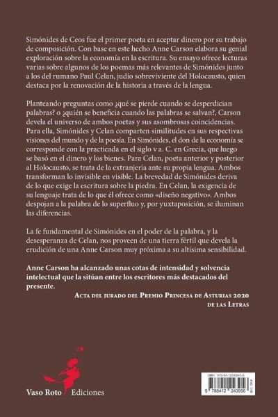 Simónides de Ceos fue el primer poeta en aceptar dinero por su trabajo poético. Con base en este hecho Anne Carson elabora su genial exploración sobre la economía en la escritura. Su ensayo ofrece lecturas varias sobre algunos de los poemas más relevantes de Simónides junto a los del rumano, Paul Celan, judío sobreviviente del Holocausto, quien destaca por la renovación de la historia a través de la lengua. Planteando preguntas como qué se pierde cuando se desperdician palabras? o quién se beneficia cuando las palabras se salvan?, Carson devela el universo de ambos poetas y sus asombrosas coincidencias. Para ella, Simónides y Celan comparten similitudes en sus respectivas visiones del mundo y de la poesía.