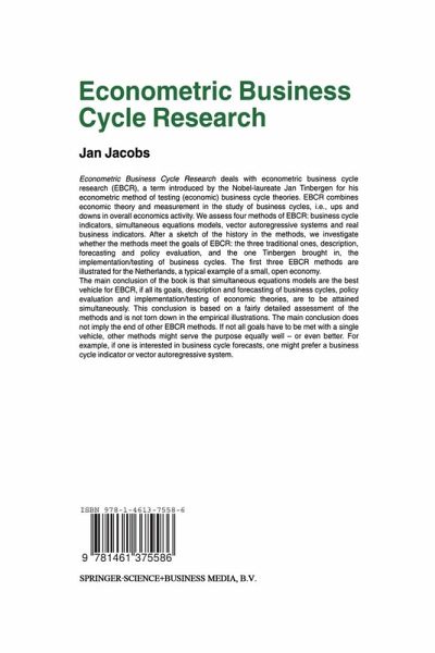 Econometric Business Cycle Research deals with econometric business cycle research (EBCR), a term introduced by the Nobel-laureate Jan Tinbergen for his econometric method of testing (economic) business cycle theories. EBCR combines economic theory and measurement in the study of business cycles, i.e., ups and downs in overall economic activity. We assess four methods of EBCR: business cycle indicators, simultaneous equations models, vector autoregressive systems and real business indicators. After a sketch of the history of the methods, we investigate whether the methods meet the goals of EBCR: the three traditional ones, description, forecasting and policy evaluation, and the one Tinbergen introduced, the implementation testing of business cycles. The first three EBCR methods are illustrated for the Netherlands, a typical example of a small, open economy.