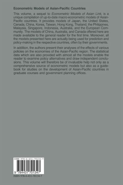 This book is a sequel to our first report of ASIAN LINK PROJECT in 1985: Econometric Models of Asian LINK, Springer-Verlag, Tokyo - Berlin - New York. Now the scope is expanded to Asian-Pacific Countries in coverage, so that this monograph presents the econometric models of Japan, the United States, Canada, China, Korea, Taiwan, Hong Kong, Thailand, the Philippines, Malaysia, Singa pore, Indonesia, Australia and the European Community. We are particularly happy to have included the excellent models of Australia and Canada whose economies are essential parts of the Asian-Pacific Economic Community. Most of those models were presented at the Workshop of Asian Link Project held in Bandung, Indonesia at the time of the Second Convention of the East Asian Eco nomic Association, 1990. Those models have been up-dated since then, and several other important models were added. Unlike our previous book, we have not tried here to link these national models as a regional or global model in any way, ex cept for the model by S. Kinoshita which offers a regional linkage for Pacific-basin economies by linking the US, Japan, Canada, the European Community coun tries as a group, Asian NIEs (Korea, Hong Kong, Taiwan), ASEAN (Indonesia, Malaysia, the Philippines, Singapore) and East Asian economies. As we argued in our previous publication, we tried to publish these econometric models again with the statistical data as much as we could, so as to enable the reader examine the estimation and performance of the models by himself.