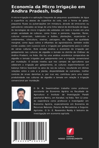 A micro-irrigação é a aplicação frequente de pequenas quantidades de água à superfície ou abaixo da superfície do solo, sob a forma de gotas, pequenos fluxos ou pulverizações em miniatura, através de emissores ou aplicadores colocados ao longo de uma linha lateral de distribuição de água. As tecnologias de micro irrigação são adotadas em todo o mundo em uma ampla variedade de culturas, como frutas e pomares, legumes, flores, culturas comerciais, tubérculos e bulbos, plantações, especiarias e condimentos, silvicultura, viveiros, paisagens, etc. Águas de qualidade marginal, como água salina e efluentes da agroindústria, também estão sendo usadas com sucesso com a irrigação por gotejamento para o cultivo de várias culturas. Este estudo analisa a economia da irrigação por gotejamento nas culturas de algodão e tomate no distrito de Chithoor de Andhra Pradesh, na Índia. Ele faz uma análise econômica comparativa de algodão e tomate irrigados por gotejamento com a irrigação convencional por inundação. O estudo revelou que nos campos de agricultores que adotaram a irrigação por gotejamento, as culturas experimentaram um balanço hídrico favorável na zona da raiz da cultura, resultando em ótimas relações entre o solo e a planta, disponibilidade de nutrientes, melhor controle de ervas daninhas e, por sua vez, contribuiu para uma maior produtividade nas culturas de algodão e tomate em relação à irrigação convencional por inundação.