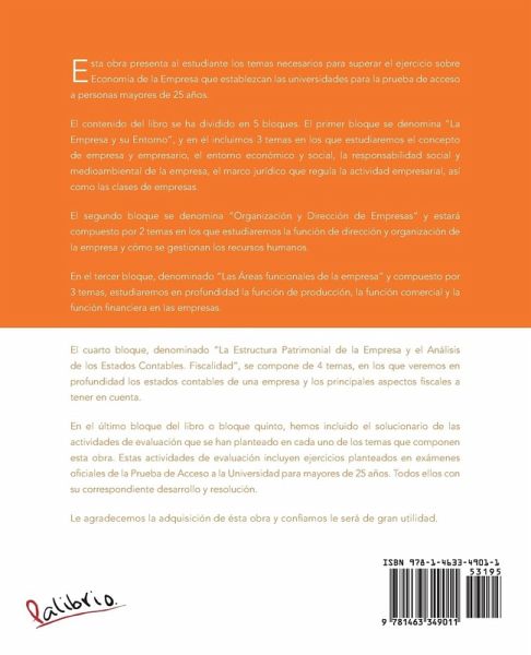 Esta obra presenta al estudiante los temas necesarios para superar el ejercicio sobre Economía de la Empresa que establezcan las universidades para la prueba de acceso a personas mayores de 25 años. El contenido del libro se ha dividido en 5 bloques. El primer bloque se denomina "La Empresa y su Entorno", y en él incluimos 3 temas en los que estudiaremos el concepto de empresa y empresario, el entorno económico y social, la responsabilidad social y medioambiental de la empresa, el marco jurídico que regula la actividad empresarial, así como las clases de empresas. El segundo bloque se denomina "Organización y Dirección de Empresas" y estará compuesto por 2 temas en los que estudiaremos la función de dirección y organización de la empresa y cómo se gestionan los recursos humanos. En el tercer bloque, denominado "Las Áreas funcionales de la empresa" y compuesto por 3 temas, estudiaremos en profundidad la función de producción, la función comercial y la función financiera en las empresas. El cuarto bloque, denominado "La Estructura Patrimonial de la Empresa y el Análisis de los Estados Contables. Fiscalidad", se compone de 4 temas, en los que veremos en profundidad los estados contables de una empresa y los principales aspectos fiscales a tener en cuenta. En el último bloque del libro o bloque quinto, hemos incluido el solucionario de las actividades de evaluación que se han planteado en cada uno de los temas que componen esta obra. Estas actividades de evaluación incluyen ejercicios planteados en exámenes oficiales de la Prueba de Acceso a la Universidad para mayores de 25 años. Todos ellos con su correspondiente desarrollo y resolución. Le agradecemos la adquisición de ésta obra y confiamos le será de gran utilidad.