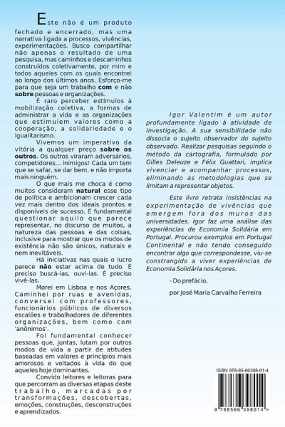 Vivemos um imperativo da vitória a qualquer preço sobre os outros. Os outros viraram adversários, competidores... inimigos! Cada um tem que se safar, se dar bem, e não importa mais ninguém. O que mais me choca é como muitos consideram natural esse tipo de política e ambicionam crescer cada vez mais dentro dos ideais prontos e disponíveis de sucesso. É fundamental questionar aquilo que parece representar, no discurso de muitos, a natureza das pessoas e das coisas, inclusive para mostrar que os modos de existência não são únicos, naturais e nem inevitáveis. Há iniciativas nas quais o lucro parece não estar acima de tudo. É preciso buscá-las, ouvi-las. É preciso vivê-las. Morei em Lisboa e nos Açores. Caminhei por ruas e avenidas, conversei com professores, funcionários públicos de diversos escalões e trabalhadores de diferentes organizações, b e m como com 'anônimos'. Foi fundamental conhecer pessoas que, juntas, lutam por outros modos de vida a partir de atitudes baseadas em valores e princípios mais amorosos e voltados à vida do que aqueles hoje dominantes. Este não é um produto fechado e encerrado, mas uma narrativa ligada a processos, vivências, experimentações. Busco compartilhar não apenas o resultado de uma pesquisa, mas caminhos e descaminhos construídos coletivamente, por mim e todos aqueles com os quais encontrei ao longo dos últimos anos. Esforço-me para que seja um trabalho com e não sobre pessoas e organizações. É raro perceber estímulos à mobilização coletiva, a formas de administrar a vida e as organizações que estimulem valores como a cooperação, a solidariedade e o igualitarismo. Convido leitores e leitoras para que percorram as diversas etapas deste trabalho, marcadas por transformações, descobertas, emoções, construções, desconstruções e aprendizados.