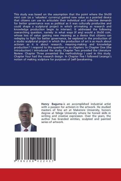 This study was based on the assumption that the point where the Shs50 mint coin (as a 'valueless' currency) gained new value as a pointed device that citizens can use to articulate their individual and collective demands for better governance was as political as it was culturally productive and could shape a sculptural project in which art-making as research and knowledge production begin to intersect. It addressed the following overarching question, namely: in what ways (if any) would a Shs50 coin, whose loss of value gaining new meaning as a device that citizens can redeploy to fight for better governance, be explored in the production of a studio sculptural project in which the production of art is as much about activism as it is about research, meaning-making and knowledge production? I respond to this question in six chapters: In Chapter One (the Introduction) I introduced the study. Chapter Two provided the Literature Review. Chapter Three presented the methodology I used in this study. Chapter Four had the research design. In Chapter Five I followed Lwanga's notion of making sculpture for purposes of [self-]awakening.