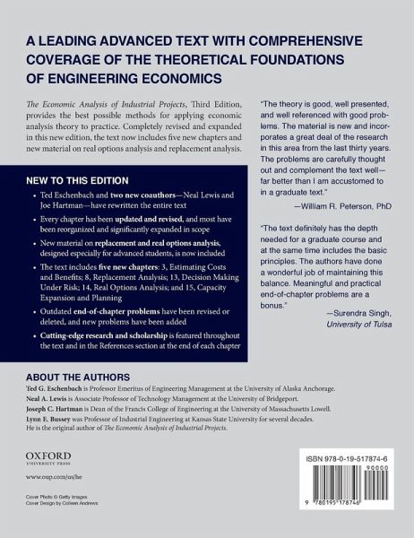Economic Analysis of Industrial Projects, Third Edition, provides the best possible methods for applying economic analysis theory to practice. Completely revised and expanded in this new edition, the text now includes five new chapters and new material on real options analysis and replacement analysis.