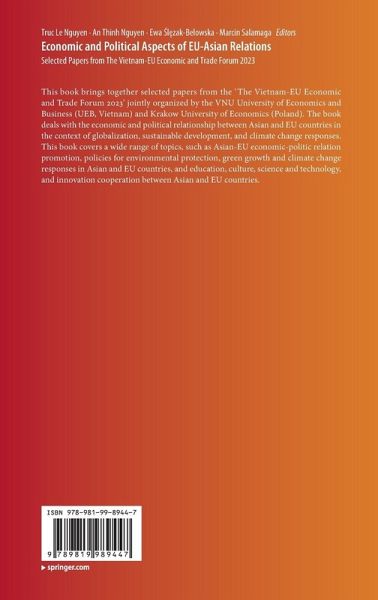 This book brings together selected papers from the The Vietnam-EU Economic and Trade Forum 2023 jointly organized by the VNU University of Economics and Business (UEB, Vietnam) and Krakow University of Economics (Poland). The book deals with the economic and political relationship between Asian and EU countries in the context of globalization, sustainable development, and climate change responses. This book covers a wide range of topics, such as Asian-EU economic-politic relation promotion, policies for environmental protection, green growth and climate change responses in Asian and EU countries, and education, culture, science and technology, and innovation cooperation between Asian and EU countries.