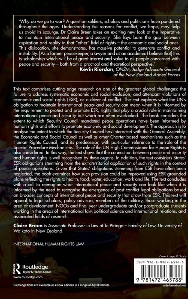 This text comprises cutting edge research on one of the greatest global challenges: the failure to address systematic economic and social exclusion, and attendant violations of economic and social rights (ESR), as a driver of conflict.¿The text explores what the UN's obligation to maintain international peace and security can mean when it is informed by the requirement to protect and promote ESR, rights that play a crucial role in maintaining international peace and security but which are often overlooked. The book considers the extent to which Security Council mandated peace operations have been informed by human rights and efforts to promote economic and social development. The approach is to analyse the extent to which the Security Council has interacted with the General Assembly, the Economic and Social Council as well as other Charter-based mechanisms such as the Human Rights Council, and its predecessor, with particular reference to the role of the Special Procedure Mechanisms. The role of the UN High Commissioner for Human Rights is also considered.