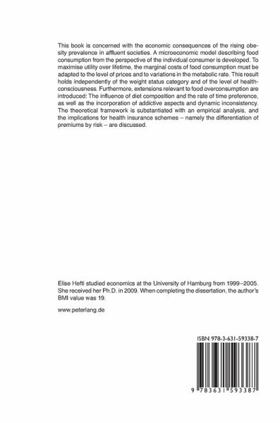 This book is concerned with the economic consequences of the rising obesity prevalence in affluent societies. A microeconomic model describing food consumption from the perspective of the individual consumer is developed. To maximise utility over lifetime, the marginal costs of food consumption must be adapted to the level of prices and to variations in the metabolic rate. This result holds independently of the weight status category and of the level of health-consciousness. Furthermore, extensions relevant to food overconsumption are introduced: The influence of diet composition and the rate of time preference, as well as the incorporation of addictive aspects and dynamic inconsistency. The theoretical framework is substantiated with an empirical analysis, and the implications for health insurance schemes - namely the differentiation of premiums by risk - are discussed.