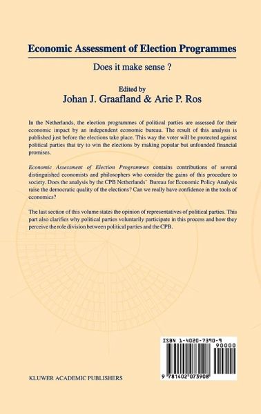 Economic Assessment of Election Programmes contains contributions of several distinguished economists and philosophers who consider the gains of this procedure to society. Does the analysis by the Netherlands' Bureau for Economic Policy Analysis (CPB) raise the democratic quality of the elections? Can we really be confident in the tools of economics? The last section of this volume states the opinion of representatives of the political parties. This part also clarifies why political parties voluntarily participate in this process and how they perceive the role division between the political party and CPB.