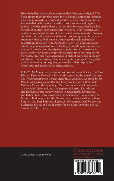 How do individuals decide to exercise their democratic rights? This book argues that they first assess their economic autonomy, meaning their ability to make a living independent of government authorities. Before individuals consider whether their resources and organizational abilities are adequate to act on their interests, they calculate the risk of political activism to their livelihood. This is particularly evident in regions of the world where states monopolize the economy and thus can readily harass activists at their workplaces. Economic autonomy links capitalism and democracy through individuals' calculations about activism. Accounts of activists' decisions about establishing independent media, leading political organizations, and running for office and descriptions of government harassment in Russia and Kyrgyzstan, along with examples from most regions of the world, illustrate these arguments. Economic autonomy and the interaction among democratic rights help explain the global proliferation of hybrid regimes, governments that display both democratic and authoritarian characteristics.