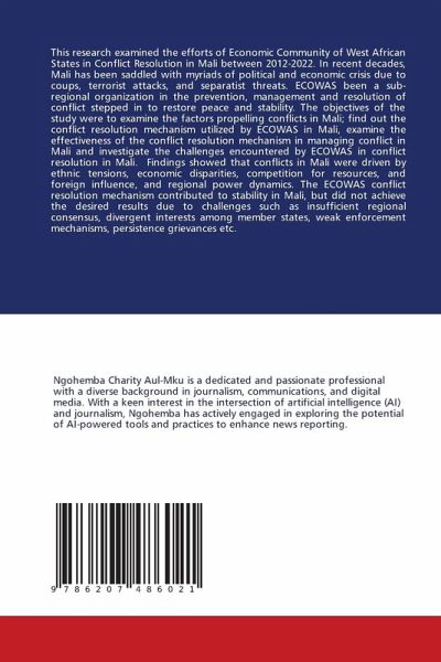 This research examined the efforts of Economic Community of West African States in Conflict Resolution in Mali between 2012-2022. In recent decades, Mali has been saddled with myriads of political and economic crisis due to coups, terrorist attacks, and separatist threats. ECOWAS been a sub- regional organization in the prevention, management and resolution of conflict stepped in to restore peace and stability. The objectives of the study were to examine the factors propelling conflicts in Mali; find out the conflict resolution mechanism utilized by ECOWAS in Mali, examine the effectiveness of the conflict resolution mechanism in managing conflict in Mali and investigate the challenges encountered by ECOWAS in conflict resolution in Mali. Findings showed that conflicts in Mali were driven by ethnic tensions, economic disparities, competition for resources, and foreign influence, and regional power dynamics. The ECOWAS conflict resolution mechanism contributed to stability in Mali, but did not achieve the desired results due to challenges such as insufficient regional consensus, divergent interests among member states, weak enforcement mechanisms, persistence grievances etc.