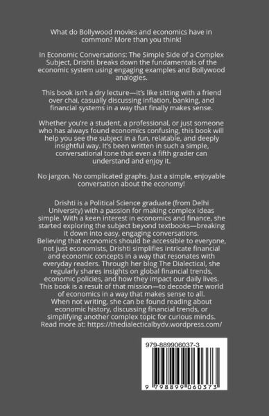 What do Bollywood movies and economics have in common? More than you think! In Economic Conversations: The Simple Side of a Complex Subject, Drishti breaks down the fundamentals of the economic system using engaging storytelling, Bollywood analogies, and real-life examples. This book isn't a dry lecture-it's like sitting with a friend over chai, casually discussing inflation, banking, and financial systems in a way that finally makes sense. Whether you're a student, a professional, or just someone who has always found economics confusing, this book will help you see the subject in a fun, relatable, and deeply insightful way. It's been written in such a simple, conversational tone that even a fifth grader can understand and enjoy it. No jargon. No complicated graphs. Just a simple, enjoyable conversation about the economy!