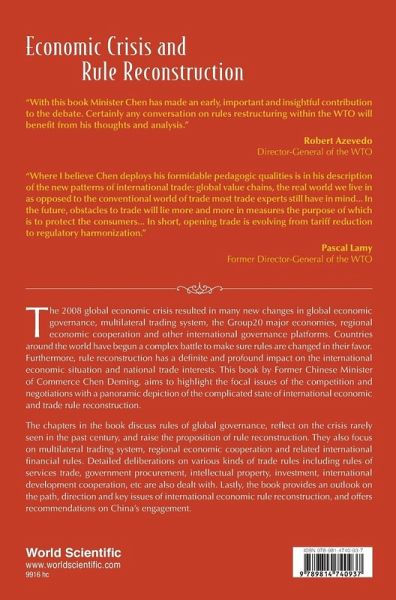 The 2008 global economic crisis resulted in many new changes in global economic governance, multilateral trading system, the Group20 major economies, regional economic cooperation and other international governance platforms. Countries around the world have begun a complex battle to make sure rules are changed in their favor. Furthermore, rule reconstruction has a definite and profound impact on the international economic situation and national trade interests. This book by Former Chinese Minister of Commerce Chen Deming, aims to highlight the focal issues of the competition and negotiations with a panoramic depiction of the complicated state of international economic and trade rule reconstruction. The chapters in the book discuss rules of global governance, reflect on the crisis rarely seen in the past century, and raise the proposition of rule reconstruction. They also focus on multilateral trading system, regional economic cooperation and related international financial rules. Detailed deliberations on various kinds of trade rules including rules of services trade, government procurement, intellectual property, investment, international development cooperation, etc are also dealt with. Lastly, the book provides an outlook on the path, direction and key issues of international economic rule reconstruction, and offers recommendations on China's engagement.